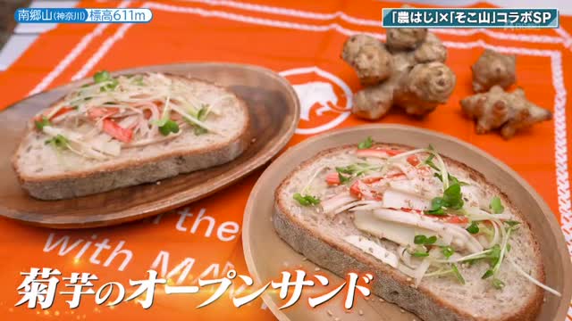 休憩ポイントで、お待ちかねの山ごはん作り。今回は、工藤さんの番組「農業はじめちゃいました」で収穫した菊芋を使ったオープンサンドを作ります。本上さんが菊芋の皮をむき、工藤さんが千切りに。それをカニカマ、貝割れ菜と合わせます。