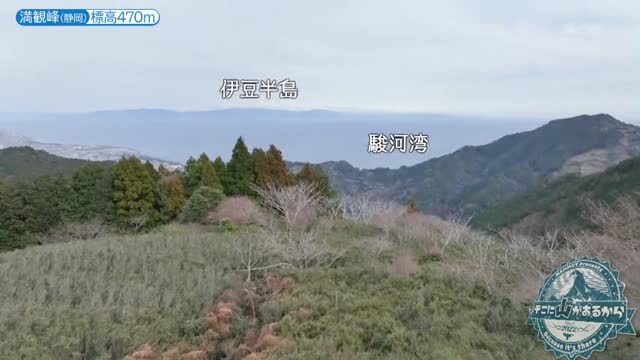 標高470mの満観峰山頂に到着。広々とした山頂からは、遮るもののない360度の大パノラマが広がります。穏やかな駿河湾と、その向こうに連なる伊豆半島の美しい景色に、南野さんも思わず感嘆の声をあげました。