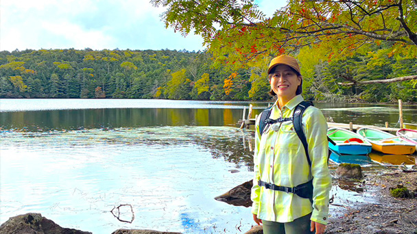 心地の良い木道を歩くと次に姿を現したのは、青く澄んだ大きな湖です。標高2,100mを超える湖としては日本最大の天然湖、白駒池。透明度が高く、この日は水面に青空が反射し美しい光景を生み出していました。