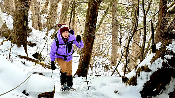 後編ではより雪深い山奥へと進み、スノーシューで険しい登山道に挑みます。