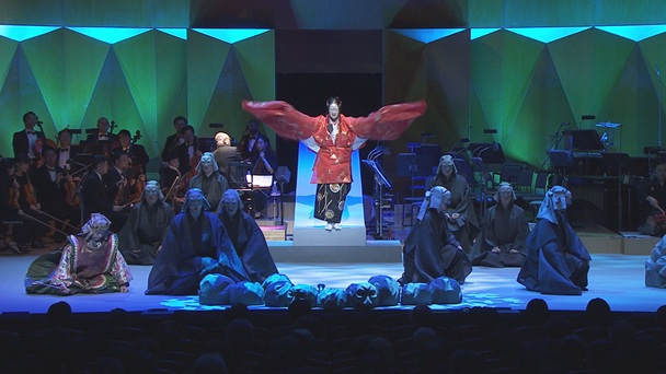 演目は、ノーベル文学賞を受賞したアイルランドの詩人イェイツの戯曲を原作とする現代能「鷹姫」。人間国宝の能楽師・大槻文蔵による謡に、野村萬斎の演出・語り、さらにアンサンブル金沢による現代音楽による演奏が溶け合い、和洋の概念を超越した深淵なる幽玄の世界に誘います。