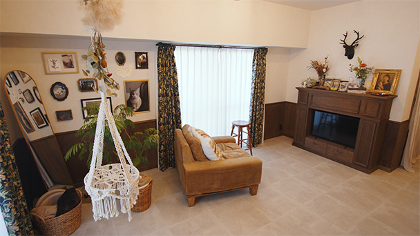 今回はこのエリアに建つ築51年の中古マンションを購入しリモデルされたO邸を訪ねます。Oさんは、リノベーション会社の広報を担当。以前は、職場に近い都内に賃貸で暮らしていましたが、「既成の間取りに家賃を払い続ける賃貸よりも、自分の暮らしに合った間取りに住みたい」というクライアントの声に共感し、中古マンションの購入を決意。「ディズニー」や「不思議の国のアリス」など、ファンタジーの世界観が大好きだというOさんは、その世界観を上手に取り込みつつ、ブリティッシュなインテリアで、まるで絵本から飛び出してきたような住まいを実現したのです。