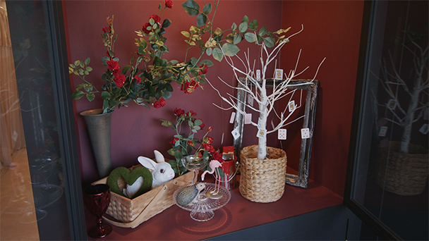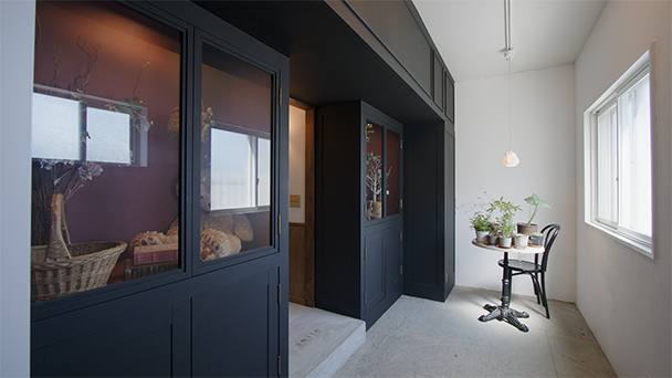 玄関を開けると、まず出迎えてくれるのは、ショーウィンドウのようなディスプレイ棚に、カフェのオープンテラスのような広々とした土間空間!扉を開けた瞬間から非日常に飛び込んだような気分を味わうことができるんです。