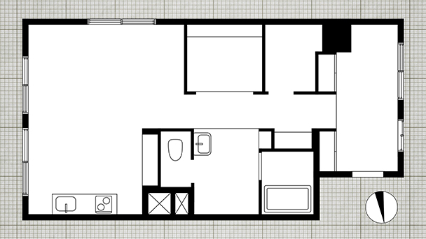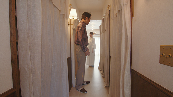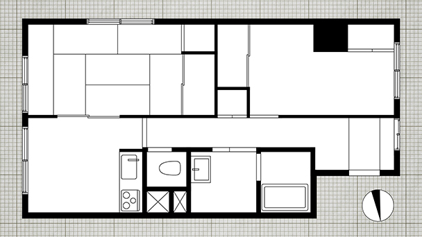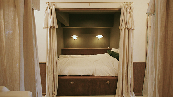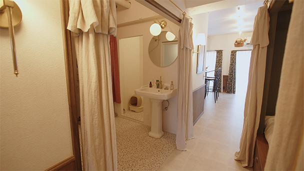 さらに玄関を進むと、まるで映画の世界に出てくる寝台列車のような廊下が出現。扉を設けずカーテンで仕切られたそれぞれの空間には、収納や寝室、水回りなどが上手に配置されており、なんとトイレも扉がない仕様に!朝起きてすぐ最初にサニタリーにアクセスしたいというOさんこだわりの間取りを今回のリモデルで思う存分叶えることができたようです。