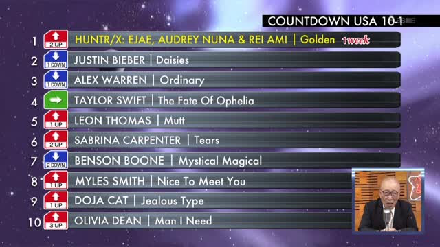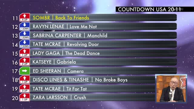 最新の全米チャートを紹介するコーナー。今週は20位から11位、そしてトップ10の楽曲が紹介されました。