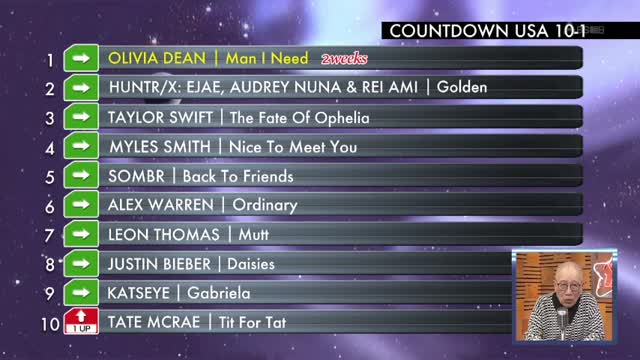 1位はオリヴィア・ディーンの「Man I Need」が2週連続で首位を獲得。小林さんは彼女の強さを称賛しました。2位にはHUNTR/Xの「Golden」、3位にはテイラー・スウィフトの「The Fate Of Ophelia」がランクインしています。