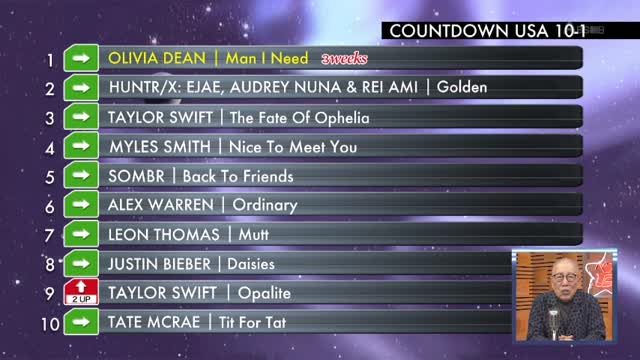 トップ10では、オリヴィア・ディーンが「Man I Need」で3週連続の1位を獲得。2位にはハントリックス、そして3位と9位にはテイラー・スウィフトの楽曲がランクインし、ベスト10に2曲チャートインする活躍を見せていることにも触れました。