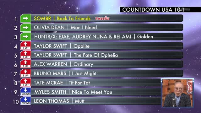 小林さんは、20歳の新星ソンバーが「Back To Friends」で2週連続の1位を獲得した快挙を伝えました。また、4位にランクインしたテイラー・スウィフトの新曲「Opalite」と、7位のブルーノ・マーズ「I Just Might」が1位を狙う注目の楽曲だと解説しました。