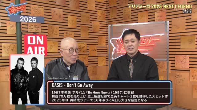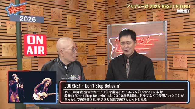 今回は、前回に引き続きゲストに有田哲平さんを迎え、有田さんがその年にヘビーローテーションで聴き込んだ過去の名作に贈る「アリデミー賞 BEST LEGEND」を発表。オアシス、ジャーニー、スパンダー・バレエの名曲にまつわる有田さんの熱いエピソードは必見です。さらに、最新の全米チャートも紹介します。