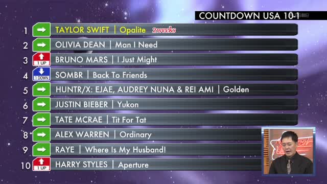 最新の全米シングルチャートを紹介。トップ10では、テイラー・スウィフトの「Opalite」が2週連続で1位を獲得し、その強さを見せつけました。一方、4位にはソンバーの「Back To Friends」がランクイン。有田さんは「来年のアリデミー賞候補に入れたい」とコメントし、注目している様子でした。