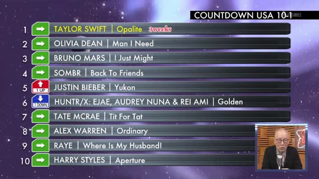 10位から1位までのランキングが発表されました。小林さんは、テイラー・スウィフトが3週連続1位、オリヴィア・ディーンが2位で強いとコメント。そして、3位にランクインしたブルーノ・マーズに勢いが出てきたと指摘しました。